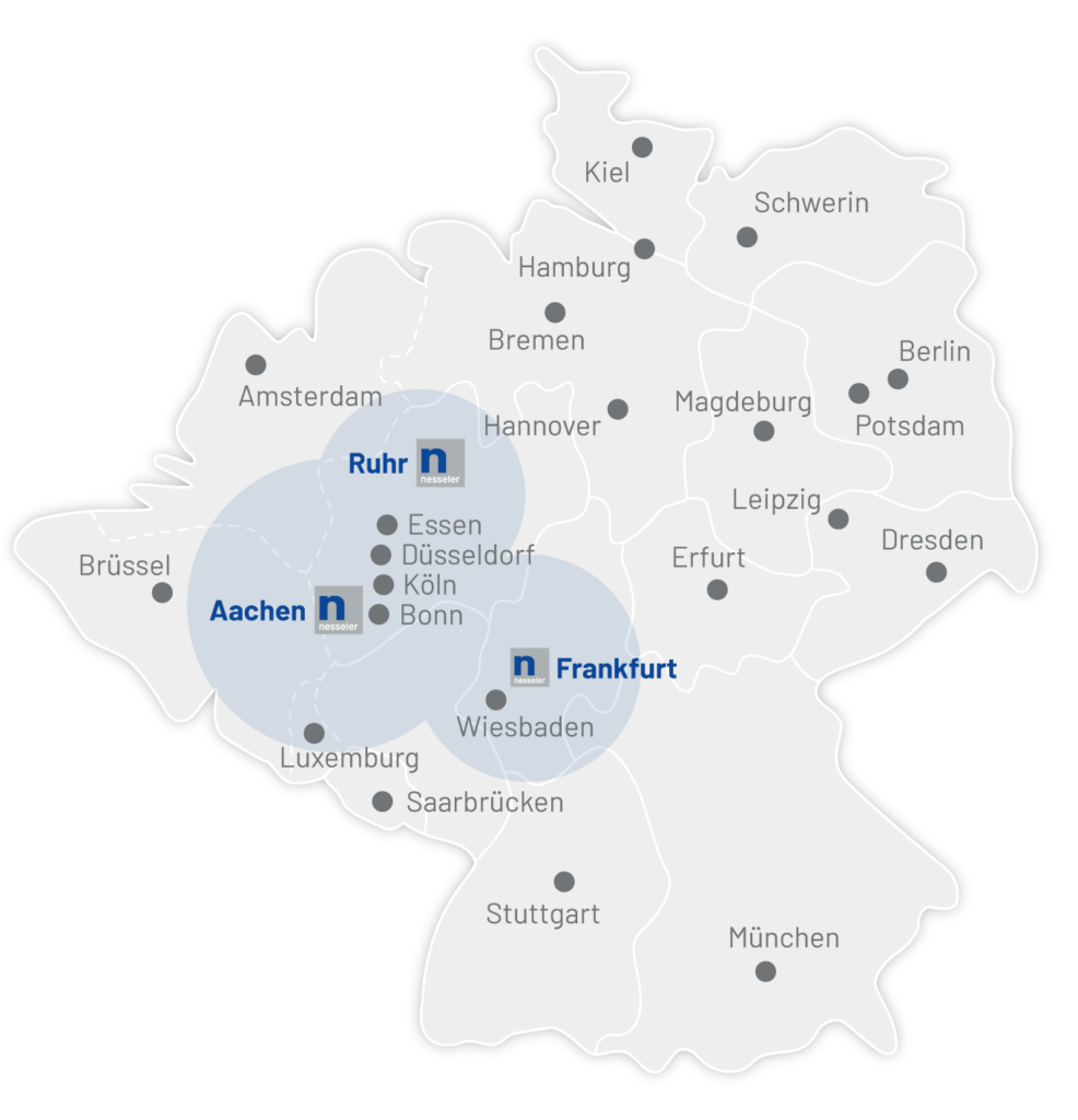 Unsere Aktivitäten sind deutschlandweit. Referenzprojekte in Berlin, Dresden, Leipzig und München zeigen das. Vom Hauptsitz Aachen aus liegt unser Leistungsschwerpunkt im Rheinland und im Ruhrgebiet. Der Aktionsradius unserer Niederlassung in Frankfurt umfasst einen Kreis von rund 100 km um den Standort.
